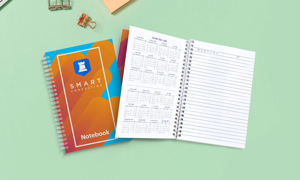 - Personalise front cover, inside front cover and inside back cover with logo, photo, or quote.